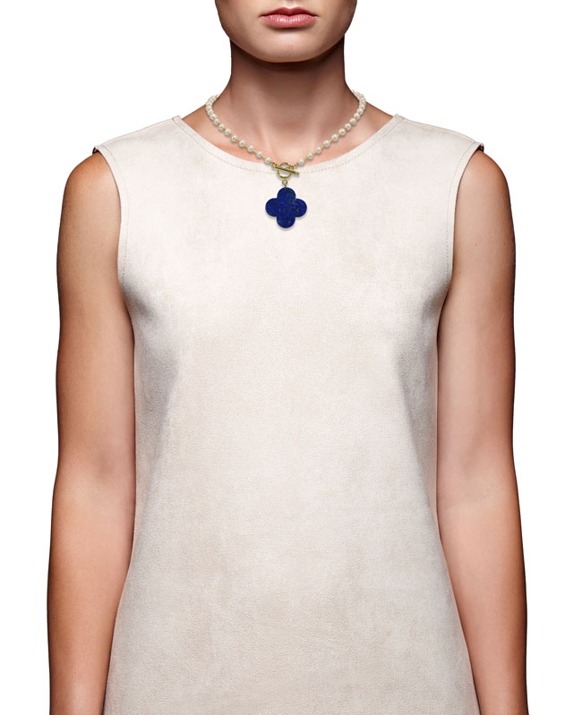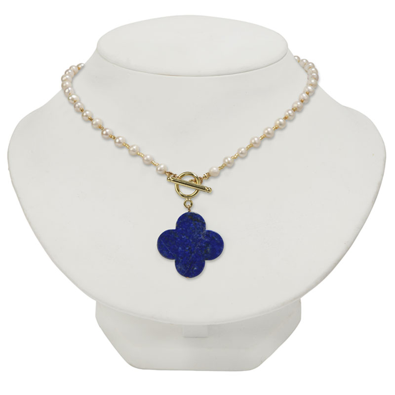 A single strand of 6mm freshwater pearls and a large, 34mm, Lapis Lazuli Quatrefoil. The toggle clasp is gold filled. 17 3/4” long.