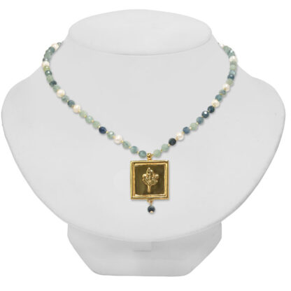 A single strand of 6mm green Kyanite and 6mm freshwater pearls with a gold vermeil plated leaf pendant. The toggle clasp is gold vermeil. 18 1/2” long.