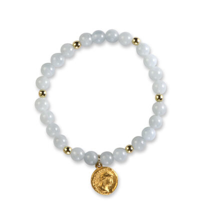 6mm Aquamarine, 4mm 16K gold filled beads and a gold vermeil Roman coin charm. 6 3/4”.