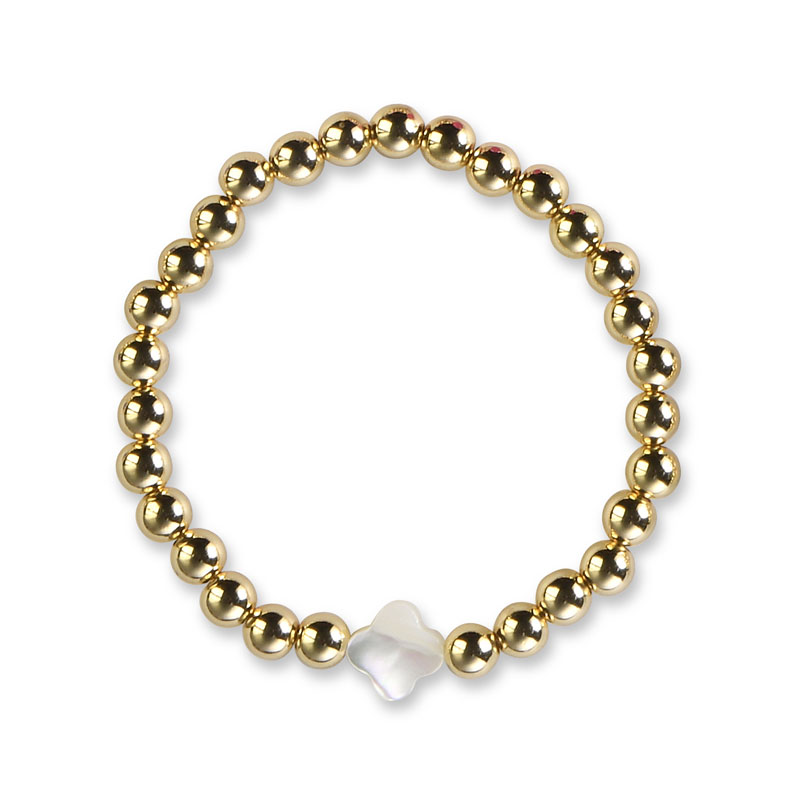 6mm 16K gold filled beads and a mother-of-pearl quatrefoil. 6 3/4”.